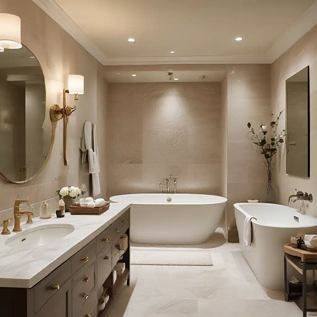 But the pampering doesn’t stop there. Indulge in the luxurious comfort of a freestanding soaking tub, where you can soak away the stresses of the day, surrounded by the gentle flicker of candlelight and the occasional sip of champagne. And let’s not forget the importance of thoughtful lighting – layers of soft, dimmable lights, complemented by statement pendant fixtures and illuminated vanity mirrors, allow you to curate the perfect ambiance to suit your mood.